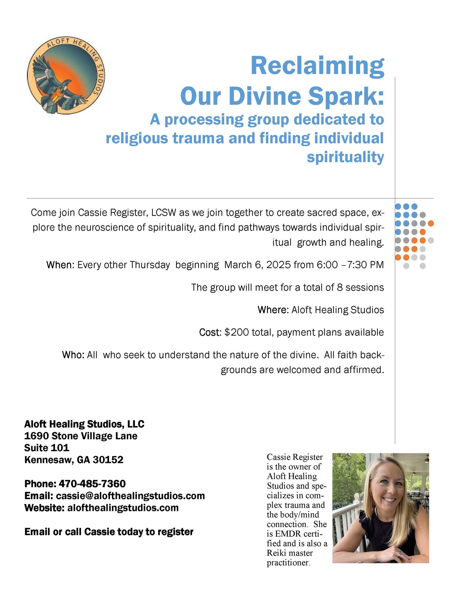 At Aloft Healing Studios in Kennesaw, we embrace and affirm all individuals. Whether you’re dealing with complex trauma, seeking spiritual growth, or need other resources, we are here to help. Contact us today to join a therapy for groups that resonates with your needs and start building a support system that will carry you through this rough patch and beyond.